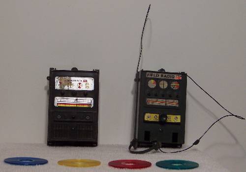 They have 4 disks between them. I suspect the records are in English. Sadly, neither radio works :-(. Both are missing the back straps and the cloth carry bag/cover. The left one is missing the antenna and the headphone set as well. |
