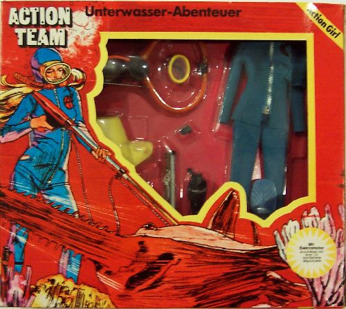 Joe never had a scuba set this color (but Action Man did). But again, it is basically taking the Joe world and rescaling. You will notice this comes with the Joe small sea sled and motor (under the packaging in front.) Another interesting item is the spear gun - it is a Palitoy Action Man type spear gun, not the GI Joe type. |